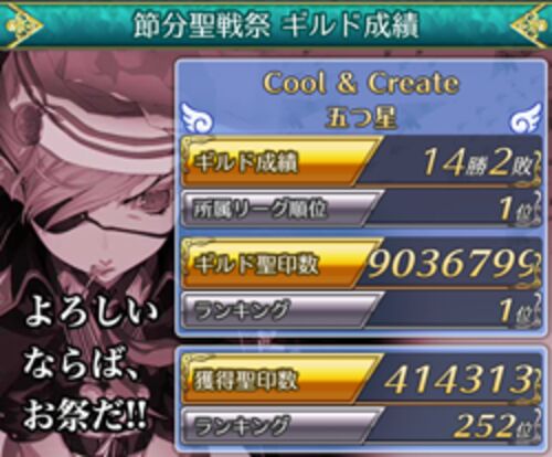 1週間続いた節分聖戦祭が終了しました。 昨日の最終日は怒涛の大逆転劇! 所属ギルド3連覇達成です! 後半戦の上位争奪戦はどこのギルドも油断できない 紙一重の激しいバトルだったのではないでしょうか。 所属ギルドも最終日の対戦のマッチング次第では 優…