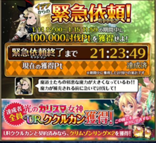 緊急イベントとして本日昼~明日昼までの間に 討伐Pt10万ptを稼ぐとカリスマ女神ククルカンがもらえますね。 早速ポチポチして2時間くらいで10万pt稼げました。 因みに特攻SR2体とSSR1体です。 完全イベスルー状態でしたので、強敵低レベルからの スタート…