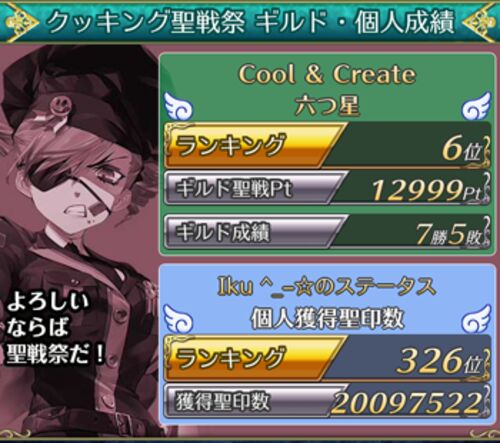 ロスクルの皆さん、お祭りお疲れ様でした! 今回の祭りは人数が満たないところが特に多かった気がします。 所属CCも中々集まらずでしたが、仲良いお友達も来てくれて 楽しく過ごさせていただきました。 結果は、、、 後半戦はリアル多忙すぎて度々参戦できず…