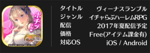 ロスクル内ではそろそろか。。。? という空気が満ちています。 スクエニとブループリントの共同開発中の ヴィーナスランブル。 公式ページをざっと見たところ、まぁロスクルの 別バージョンってところでしょうか。 以前やってた拡散性ミリオンアーサー終了…